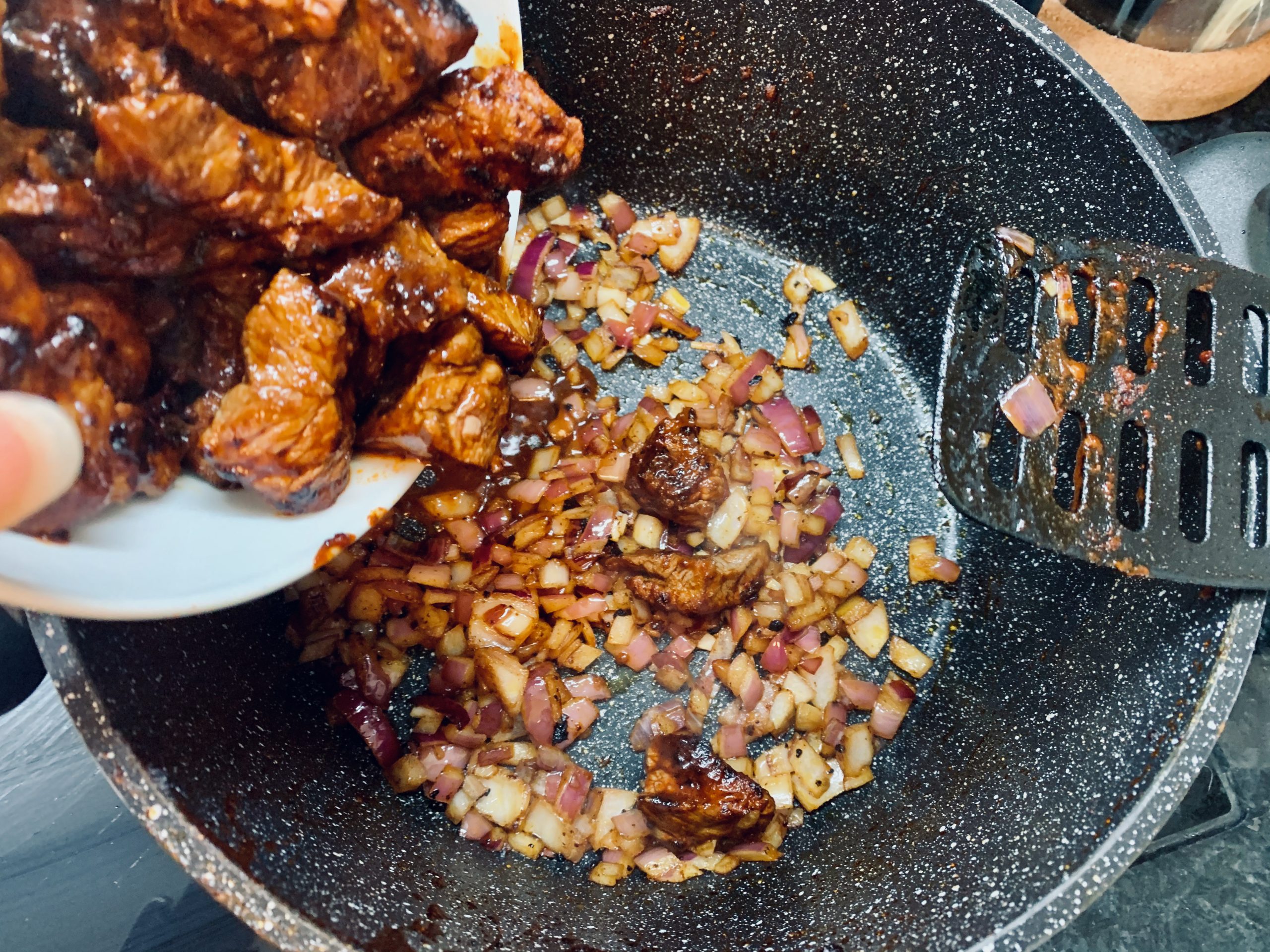 • Nun die Zwiebeln im selben Topf wie das Fleisch auf mittlerer Hitze andünsten. Falls nötig, kannst du noch etwas Öl dazu geben. Du möchtest, dass die Zwiebeln schön glasig werden und dabei nicht anbrennen ☺️Tiroler Gulaschsuppe - Zwiebeln glasig