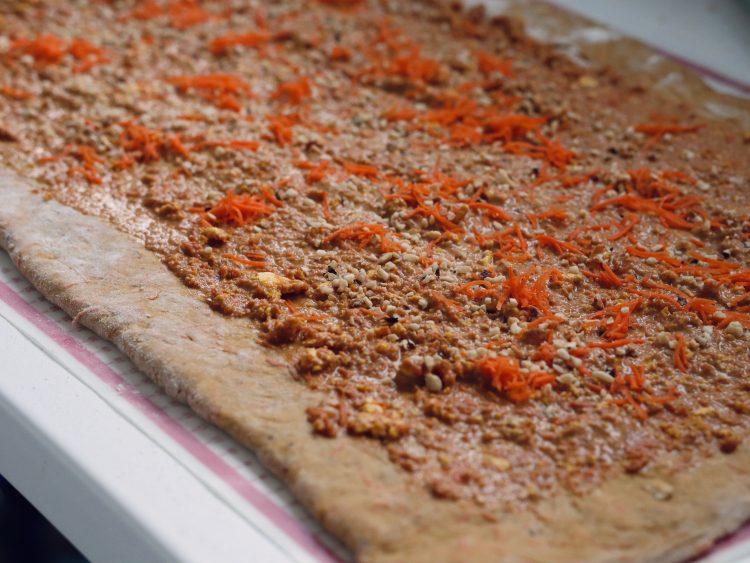 Um also die Hauptmerkmale zusammen zu bringen, habe ich mich entschieden Karotten sowohl in den Teig, als auch die Füllung zu bringen. Damit die Hefeschnecken weiterhin schön aufgehen, habe ich für die Schnecken selber nur mit gemahlenen Nüssen gearbeitet. Der Biss wurde mit den gehackten Nüssen dafür in die Füllung gebracht. Die buttrige Komponente der Hefeschnecke durfte natürlich in der Füllung nicht fehlen. Dank der Säure des Schmands, wirken die Schnecken auf mich nochmal wesentlich leichter.